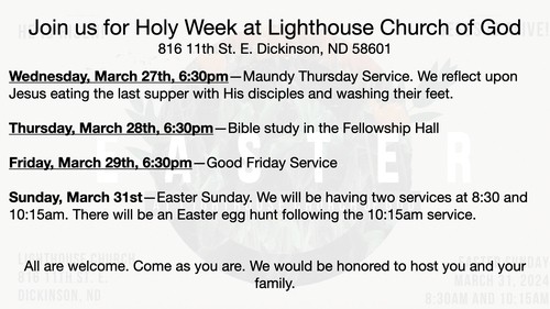 At Lighthouse, we take some time to pause, reflect, remember, and celebrate Jesus' passion, example, Last Supper, death, burial, resurrection, and ascension. Join us for Holy Week and Easter at Lighthouse.